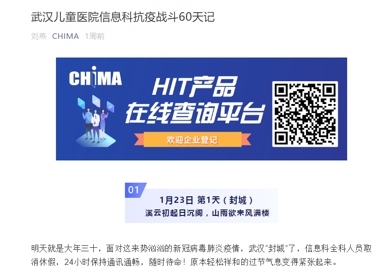 2020年初,新型冠狀病毒肺炎爆發(fā),疫情防控阻擊戰(zhàn)全面打響,全國各省市醫(yī)務工作者義無反顧,奔赴武漢,開展救治工作。3月23日,CHIMA(中國醫(yī)院協(xié)會信息管理專業(yè)委員會)微信公眾號發(fā)表文章《武漢兒童醫(yī)院信息科抗疫戰(zhàn)斗60天記》,詳細記載了武漢市兒童醫(yī)院利用信息技術助力疫情防控的過程。