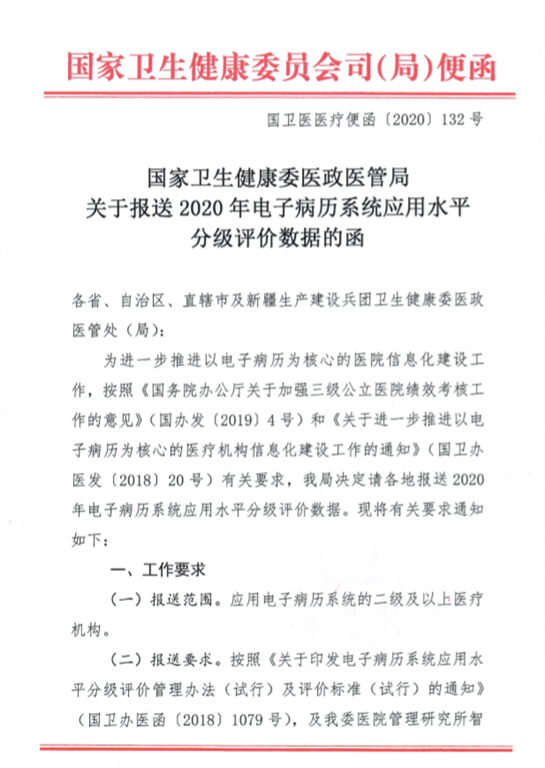 為進(jìn)一步推進(jìn)以電子病歷為核心的醫(yī)院信息化建設(shè),按照《國(guó)務(wù)院辦公廳關(guān)于加強(qiáng)三級(jí)公立醫(yī)院績(jī)效考核工作的意見(jiàn)》和《關(guān)于進(jìn)一步推進(jìn)以電子病歷為核心的醫(yī)療機(jī)構(gòu)信息化建設(shè)工作的通知》,國(guó)家衛(wèi)生健康委醫(yī)政醫(yī)管局發(fā)布《關(guān)于報(bào)送2020年電子病歷系統(tǒng)應(yīng)用水平分級(jí)評(píng)價(jià)數(shù)據(jù)的函》,請(qǐng)各地報(bào)送2020年電子病歷系統(tǒng)應(yīng)用水平分級(jí)評(píng)價(jià)數(shù)據(jù)。