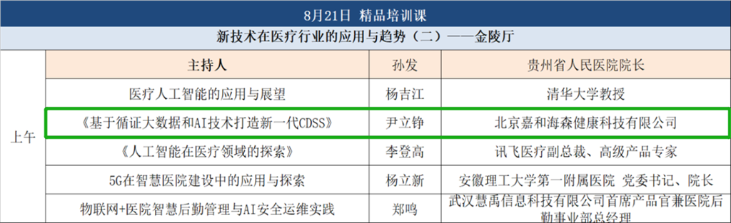 會議期間,嘉和海森健康大數(shù)據(jù)事業(yè)部醫(yī)療AI高級專家尹立錚將于8月21日“新技術(shù)在醫(yī)療行業(yè)的應(yīng)用與趨勢”精品培訓(xùn)課中以《基于循證大數(shù)據(jù)和AI技術(shù)打造新一代CDSS》為題,詳細(xì)闡述嘉和美康基于歷史病歷學(xué)習(xí)與循證醫(yī)學(xué)知識庫“雙引擎”的新一代CDSS技術(shù)與應(yīng)用。