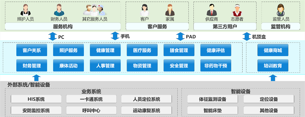 嘉和健康養(yǎng)老管理信息系統(tǒng)以客戶一體化養(yǎng)老需求為出發(fā)點(diǎn),從入出轉(zhuǎn)等業(yè)務(wù)辦理到養(yǎng)護(hù)文娛等日常養(yǎng)老生活,很好的支撐了養(yǎng)老運(yùn)營的標(biāo)準(zhǔn)化、精細(xì)化、智能化管理需求。系統(tǒng)結(jié)合各類智能終端,通過與相關(guān)外部系統(tǒng)及智能設(shè)備的對接,形成一體化醫(yī)養(yǎng)結(jié)合養(yǎng)老解決方案。