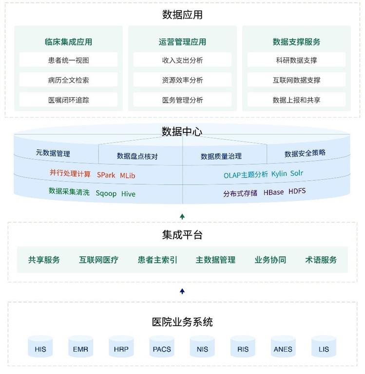 嘉和美康為用戶提供基于數(shù)據(jù)中心的互聯(lián)互通建設(shè)方案,通過企業(yè)服務(wù)總線和大數(shù)據(jù)技術(shù),整合醫(yī)院現(xiàn)有信息資源,實現(xiàn)醫(yī)療數(shù)據(jù)交換、存儲和治理,建立電子病歷共享文檔庫,并構(gòu)建全院實時全量數(shù)據(jù)中心,在實現(xiàn)院內(nèi)信息互聯(lián)互通的同時,也為醫(yī)院提供統(tǒng)一的對外數(shù)據(jù)服務(wù)窗口,支撐大數(shù)據(jù)和互聯(lián)網(wǎng)應(yīng)用。在此基礎(chǔ)上,為醫(yī)院提供一系列智能應(yīng)用,提升臨床、精細(xì)化管理等方面的數(shù)字化決策水平。