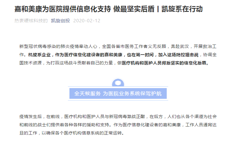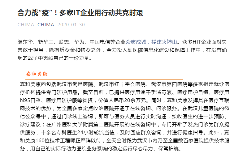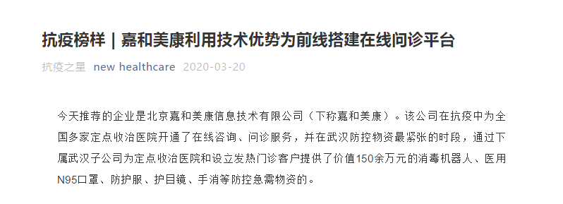 疫情期間,嘉和美康勇?lián)鐣熑危瑓f(xié)調(diào)全國技術(shù)資源,用科技力量助力疫情防控。