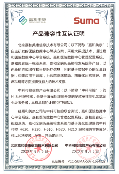 9月,嘉和美康與中科可控信息產(chǎn)業(yè)有限公司完成了部分核心產(chǎn)品的產(chǎn)品兼容性認證測試。根據(jù)測試結(jié)果,嘉和美康自主研發(fā)的醫(yī)院數(shù)據(jù)中心解決方案、電子病歷V6軟件與基于海光處理器的中科可控H620、H320、H610、H520、H210服務(wù)器兼容性良好,可以順利安裝、配置,并穩(wěn)定運行。