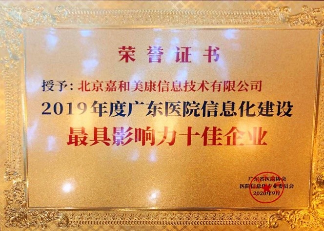 2020年,在由廣東省醫(yī)院協(xié)會醫(yī)院信息化專業(yè)委員會主辦的2020年華南醫(yī)院信息網(wǎng)絡(luò)大會上,嘉和美康獲得了由廣東省醫(yī)院協(xié)會頒發(fā)的“2019年度廣東醫(yī)院信息化建設(shè)最具影響力十佳企業(yè)”榮譽稱號。