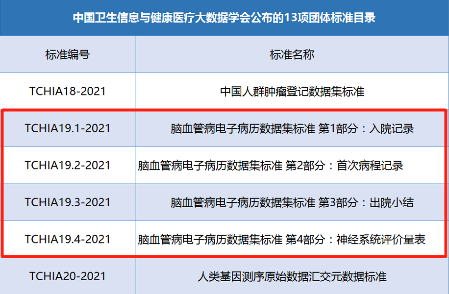 中國衛(wèi)生信息與健康醫(yī)療大數(shù)據(jù)學(xué)會(huì)公布的13項(xiàng)團(tuán)體標(biāo)準(zhǔn)目錄局部