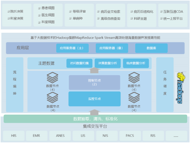 嘉和美康公司基于Hadoop大數(shù)據(jù)平臺(tái)為業(yè)界提供成熟的醫(yī)院數(shù)據(jù)中心解決方案,以創(chuàng)新的方式儲(chǔ)存和呈現(xiàn)醫(yī)療資料,實(shí)現(xiàn)以患者為核心的醫(yī)療信息采集、存儲(chǔ)和展現(xiàn)、應(yīng)用功能,構(gòu)建醫(yī)療信息咨詢、檢索、展現(xiàn)、醫(yī)療決策支持平臺(tái)。同時(shí)基于數(shù)據(jù)中心的全量數(shù)據(jù),構(gòu)建應(yīng)用主題庫(kù),為醫(yī)院臨床輔助、精細(xì)化運(yùn)營(yíng)管理、科研、提供強(qiáng)有力的數(shù)據(jù)支撐。