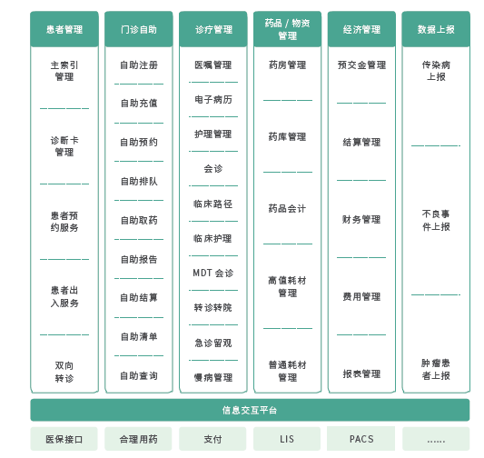 涵蓋門診、住院、醫(yī)技、區(qū)域協(xié)同及管理監(jiān)督等相關(guān)業(yè)務(wù),能夠?qū)崿F(xiàn)業(yè)務(wù)流程閉環(huán)、數(shù)據(jù)共享、業(yè)務(wù)管理一體化。
