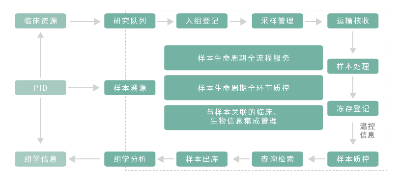 基于S O P,從研究對象登記、標(biāo)本采集、標(biāo)本送存、標(biāo)本核收、標(biāo)本處理、樣本入庫、樣本出庫等各個環(huán)節(jié)嚴(yán)格管控,形成完整的樣本全流程/ 全生命周期管理記錄。