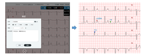 在心電波形圖上直接進(jìn)行各種標(biāo)識,能夠清晰體現(xiàn)異常出現(xiàn)的位置,作為診斷結(jié)論的下達(dá)依據(jù),標(biāo)記點(diǎn)可直接用于查詢統(tǒng)計(jì)與科研分析。